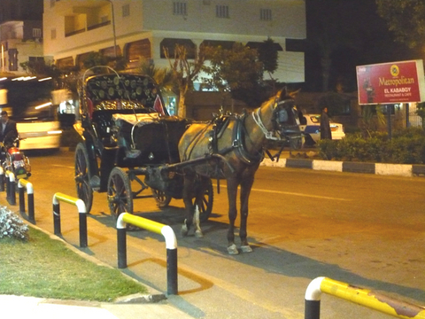 ルクソール最後の夜は、荷物回収のために予定より早めに動いたので、時間がたっぷりありました。そこで、夕食後、人々で賑わう夜のバザールへ行ってみることにしました。乗ったら最後、ぶったくられるのは必定、という馬車に乗って(笑)