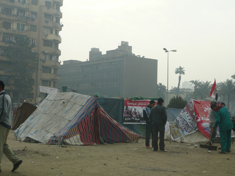 ツタンカーメンのマスクのあるエジプト博物館の前には、ニュースの現場、タハリール広場があります。博物館の横の政府の建物は、火災の後の生々しさを残していますが、博物館も広場もいたって平和なもの。タハリール広場には、いくつものテントが張られていますが、革命を担った人々のものではないとか。ジュースのスタンドが出ていたり、お茶会が模様されていたり、このテント村そのものが観光名所になりつつあるような具合です(笑) もちろん、普通に人が通り抜けているし、観光客がうろうろしても問題はありません。