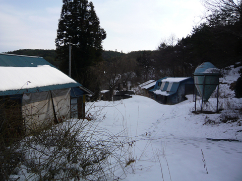 長泥地区から国道を少し峠を上っていくと、クルマの中でも急に数値が上がる場所があります。谷からもろに風が吹きつけてくる場所だからだそうです。ここに谷に向って1軒の家が建っていました。もちろん、無人。そこに1台の乗用車が走ってきて、停まりました。中から出てきた女性が、何かをもって家の中へ。滑る、滑るの雪の中を何を運んでいるのだろうと思ったら、「猫のエサ」でした。