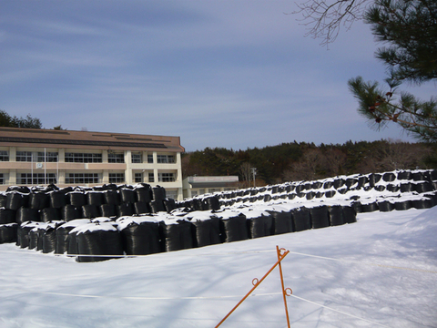 海岸線から離れて、広野町へ行くと、ちょうど帰町のための説明会が行われていました。役場前の線量は0.18μSv/h(マイクロシーベルト/1時間当たり)でしたが、集会場の前では0.65μSv/hになっていました。ちょっとした位置や風向きで数字は違ってくるようです。集会場の上の広場には、除染した土が集められたビニールシートがずらっと並んでいます。これ、どうするんでしょうねぇ。まだ行き先が決まっていないにちがいありません。住民らしき方々は、あちこちからクルマでやってきて、マスクをつけたまま集会場に吸い込まれていきました