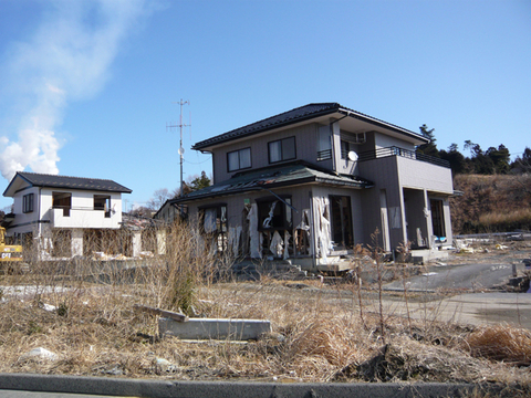 沿岸部に行くと、いまだにまるっきり何もない風景が広がっています。いまだにというのはちょっと変ですね。津波で完全に破壊された家々の残骸は片付けられていて、広大な土地に家の土台だけが残っています。直後はまるっきり何もないわけではなく、やっと「何もない」状態にまで片づいたということでしょう。もう少し「片づけ」が進んでいるところでは、本当にただただ土地が広がっていましたが、南相馬から北上した沿岸部は、土台がまだ残っている状態でした。
