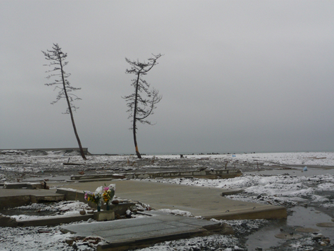 14人の生徒が犠牲になった閖上(ゆりあげ)中学校、正面の時計が「その時間」を指したままとまっています。まだ引き取り手のない写真や品物が展示されている体育館に立ち寄りました。泥にまみれたランドセル、卒業証書や家族写真、ボランティアの人々の手で、できる限り整理されています。こんなにたくさんの物がまだここにのこされているということは、避難したまま帰ってこられない人の物もあるでしょうし、一家がみんな亡くなってしまったということもあるのかもしれません。泥だらけのランドセルに、思わず立ちすくんでしまいました。1年も前のできごとだったとは思えない……。