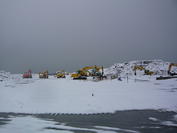その地図上の1点に私たちはいるわけですが、その1点から見る風景は、限りなく何もない……。瓦礫を処理しているショベルカーは数えてみたら1ヵ所に20機が働いていました。その1台、1台がまるでアリンコのように見えるほど、何もない地面が広がっています。復旧、復興の速度が遅いという苛立ちの声をよく耳にしますが、この広さじゃ、そう一朝一夕には……と思わされます。地図上の1点でこれだけの「何もない」地面が広がっているのに、地図にはべったりと広範囲に色がついているのですから。もっと北のほうをみれば、岩手県に向って海岸線は広く色付きです。