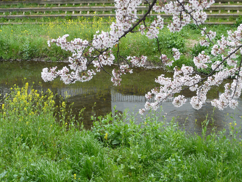 そのかわり、菜の花が川辺を黄色く染めています。いまが盛りといったところでしょうか。例年は、桜と菜の花の競演という風情になるのですが、今年は菜の花が少し出遅れたようで、桜が真っ盛りのときは、黄色はまだまだという感じでした。桜が主役を降りてくれたので、これからは菜の花が頑張る!というふうに見えなくもありません(笑)
