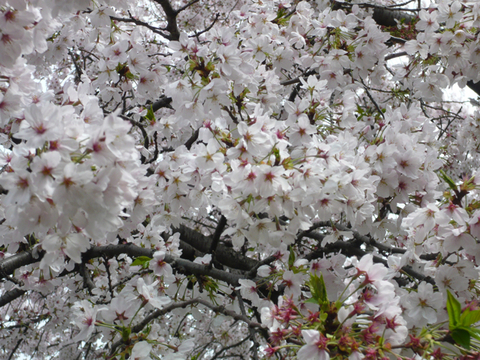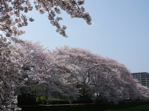 昨日の風は、やはりそんなに桜にダメージは与えなかったようで、今日もまだお花見に耐えられる状態でした(^_^;) けっこうお花見ピクニックをしている人もいて、おいしそうなお弁当がシートに並べられているのを見るとうらやましいなぁ〜と思わされます。と言っている間にも、花びらははらはら、はらはらと舞い落ち、本当に雪が降っているように感じられます。暖かいのだけれど。歩道も真っ白と言っていいほど、花びらが積もり始めています。これで葉桜になってくると、「初夏!」という感じになりますね。