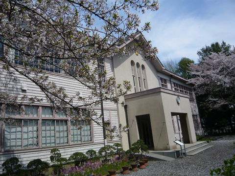 お茶会が行われたのは「府中市・郷土の森博物館」というところです。ここには広々としたお庭のほかに、府中市内から移築されてきた昔の小学校や郵便局、民家などもあり、散歩するだけでも楽しめるところです。梅林が有名なようですが、いまは桜が散りかけているところ。そろそろ青葉が繁り始めていて、花壇には色とりどりのチューリップやケシなどの花が開いていました。