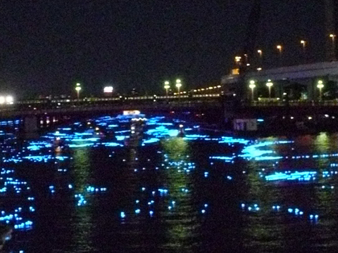 ホンモノのホタルの季節には、まだ、いささか早いと思われますが、隅田川に発光ダイオードのホタルが輝いていました。水に浸かると青い光を発光するというLED電球約10万個をホタルに見立てたイベント「東京ホタル」。このLEDは「いのりの星」と名づけられているそうです。死者に祈りを捧げる灯籠流しと、光のイリュージョンがミックスされたような美しい風景が見られました。
