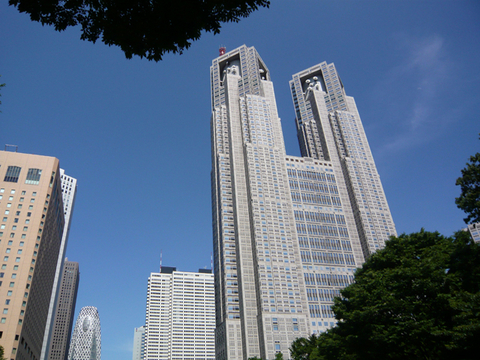 もうすぐ7月だというのに、昼間でも肌寒いくらいで、木陰のベンチより日向のベンチを探すくらい。ちょうど空いていたベンチから、顔を上げると正面が都庁。そして、なんと澄み切った青空でしょう! まるで秋の空のようです。低空で飛んでいった飛行機もくっきり見えました。いまが梅雨期だなんて、とても信じられませんね。
