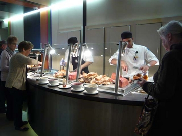ブッフェはスープ、サラダから、さまざまな煮たり焼いたりした料理、ターキーやローストビーフなど盛りだくさん。デザートも充実していて、飲み物もコーヒー、紅茶、ジュース、コーラなど、いろいろなものが飲み放題。ただし、アルコール類はありません。このときとばかり、食べまくりました(笑) 野菜スープがとてもおいしく、焼き立てを切り分けてくれるビーフやポークもおいしかったです。ターキーだけは、なぜかパサパサだったけど。デザートはケーキやなんだか甘そうなものがたくさんありましたが、自分で注ぐソフトクリームがさっぱりしてておいしかったです。トッピングのチョコレートがうまく乗せられなかったのですが、食べてしまえば同じです(笑)