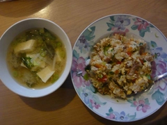 朝っぱらから歩きの、しゃべりので忙しい一日は、夕方も昨日のから揚げの残りを刻んでチャーハン作りという労働が待っておりました(笑) カレンが「ミソスープ」には豆腐とわかめが絶対に必要だと思い込んでいるので、大根もおいしいよと作って見せました。ここら辺で大根は「チャイニーズ・ラディッシュ」とか「ホワイト・ラディッシュ」とかいうようですが、なぜか「ダイコン」でも通じます(^-^;) 日本の大根に比べると小ぶりでみずみずしさに欠ける感じですが、普通に大根の味がします。それでも残りの豆腐を入れるんだというカレン……。