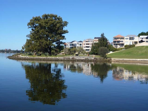 ランチの前にそこら辺に散歩に行きましょう、と。そこら辺というのは、クルマでびゅーっとスワン川のほとりの散歩コースということです。そこら辺が遠い……(笑) パースには珍しく7階建て、8階建てという高層集合住宅が並んでいます。昔は、貧乏な人の住む地区だったところで、いまは貧乏な人と単身者のために、高い、高い建物が増えているとのこと。もっと高層マンションを見慣れている土地の狭い日本の住人としては、高層アパート街と言われても、まったく“高層”には感じられません。住み心地がよさそうです。一部は、ホリディアパートメント(週単位で賃貸)になっているそうです。