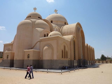 アレキサンドリアからカイロへ帰る途中に、コプト教の修道院がいくつかあります。メインストリート砂漠の道から、さらに砂漠の奥へと進まなければならないので、一般的に観光で行く人は少なく、ベテラン添乗員のゴーちゃんでさえ、行ったことがないという場所でした。エジプトはイスラームの国というイメージがありますから、キリスト教の遺跡を訪ねるという視点がないといえば、ないような気もします。たまたま日本語ガイドのミーナさんが貴重な13%(笑)だったこともあり、ここに立ち寄ってもらうことを思いつきました。