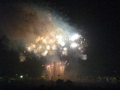 私たちが眺めていたベランダの下では、隣の家の屋根の上に何家族かが集合していたらしく、子どもたちの元気な声が聞こえてきました。「たまや〜」とか「がぎや〜」とか。誰に教わるんでしょうね、そんな江戸時代の掛け声(笑) 終わる頃には、「アンコール! アンコール!」と叫んでいましたが、さすがに河原までは届かなかったでしょう(^_^;) 花火は定時に終わりました。夜空に咲く花をカメラで捉えようとしましたが、手ブレをしたり、タイミングを逃したり、なかなかうまく撮ることができませんでした。たくさんシャッターを押してみたのですけど。やっぱり花火の美しさは、ナマで見ないとねぇ。