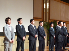 人気選手が各ポジションごとに9人。最初に社長と選手の挨拶があったあと、ひとりずつ選手のプライベートトークを聞くというようなパーティで、誰かがインタビューを受けている間は、それ以外の選手はサインをしたり、お客さんと一緒に写真を撮ったり。約2時間ぐらい経ちっ放しで接客(?)ですから、選手も大変です。ファンのほうも順番待ちの行列に並ぶのがこれまた大変。とくに番長、三浦投手の列は、すごく長くて、そういうことに熱心なファンというわけでもない私は、見ただけであきらめました(笑)