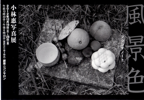 今年の春先に、私を福島に連れて行ってくれた写真家の小林恵さん。震災後すぐから福島に通い、現場の写真を撮り続けてきました。今日、それらの写真をまとめて「風景色---フクシマノート」という写真展を開くお知らせのハガキをもらいました。2012年12月19日(水)〜28日(金)、銀座ニコンサロンです。「早くまとめて写真展をやって!」とお願いしていたので、すごく楽しみにしています。