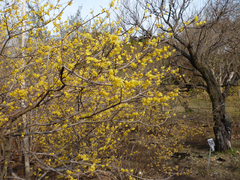 梅はまだですが、黄色のローバイは真っ盛りでした。黄色の色が濃いのは「リシンローバイ」、色の薄いのが「ローバイ」と表示されていました。蕾はつけているものの全体に枯れ枝のように見える梅園と常緑樹の緑が少し見られる程度の庭園に鮮やかな黄色が生えています。神代植物園は、ローバイは少ないので、目立ちます。花らしい花と言えば、あとは1本だけ地味な赤い花をつけているマンサクだけでしたから。