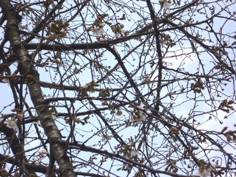 ちょっと用事があって外出したので、駆け足で桜の開花具合のパトロールをしてきました(笑) 昨日、見に行ったときはまだ1輪も咲いていなかったのですが、今日は開花を見つけました! 1本の木に5、6輪というところですから、気象庁的な開花宣言ができるのではないでしょうか(^_^;) 上のほうにちょっとだけ咲いているだけで、全体としてはまだ蕾はピンクになっているものも少ないという感じですけど。