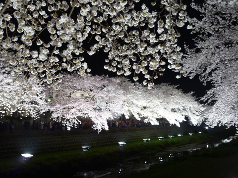 ほぼ同じ場所、ほぼ同じ角度で、昼間とライトアップ時の写真を撮って比べてみるのもなかなかおもしろかったです。野川のライトアップは、普通の照明ではないので、本当にくっきり、はっきり花びらが照らされます。つまりは、昼間の風景のバックをすべて墨で消して、桜だけを浮き立たせたようになる
