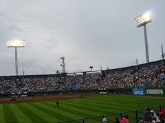 旭川スタルヒン球場は、日本で初めて人名をつけた球場として有名なのだそうです。命名されたのは1982(昭和57)だそうです。すみません、知りませんでした(^_^;) 名前はともかく、普通の市営球場なのですが、北海道では珍しい、ナイター設備のある球場ということで、なんと私たちが見た試合が、北海道で初のプロ野球屋外ナイトゲームだったそうで。つまり札幌ドーム以外で初めてのナイター。といわけで、号外まででていて、大盛況。しまった、甘くみていてチケット買ってない……。走って窓口に行き、外野席を購入。いつもは内野派ですが、地方にビジターで行った場合、内野には味方がひとりもいず、外野でも一握りなので、ここは外野を選択しました。