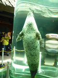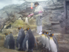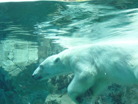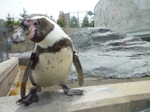 まずは有名なペンギン。有名なのは、冬場の雪道散歩で、夏はただそこにペンギンがいる、と(笑) でも、空飛ぶペンギンですよ。本当に空を飛ぶのではなくて、ペンギンの水槽の下に通路があるので、見上げるとまるでペンギンが頭上を飛んでいるように見えるという趣向です。ところが、みんなモグモグのほうへ行ってしまって、ほとんど空にペンギンはいませんでした。何を見たいかによって、時間帯を選ばなければいけないようですね。しかし。ペンギンって、アップで見ると、そんなに可愛くはないと……(笑)