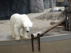 次のモグモグは、白熊。水槽がスパッと縦に切ってある感じで、白熊が小魚を捕まえてくわえるシーンが目前。これはなかなか迫力がありました。ガラスがあるからいいけれど、本当に目の前に出てこられたら、きっと怖いと思うでしょうねぇ。大きいし。モグモグが終わった白熊は、屋外でのそのそ。これを間近でのぞけるカプセルが用意されています。それをまた外から見ると、カプセルの中に人間の頭が出たり、入ったり。どっちが見られているのかわかりゃしない(笑) このカプセルはあちこちにあって、「ウサギ目線でオオカミを見る」とか、なかなか楽しかったです。