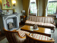 ゆっくり、といってもそれは平日の午後だったからで、週末などはテーブルにきっしりお客さんという状態で、なかなかゆっくりもできないようですけど。入場料100円、喫茶が500〜600円。静かな平日には、しっとり濡れた菖蒲も咲く庭を堪能できて、許されるなら本でも読むか、昼寝ぐらいしたいところでした。玄関近くには暖炉のある洋間もあって、大正末期から昭和の始めにかけてのお金持ちの邸宅の典型であるらしいです。