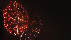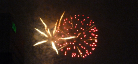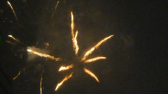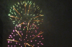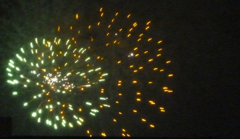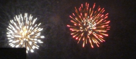 試し運転のような花火の音を聞きながら、まずは宴会。早々と酔っ払ったあたりで、花火が開始されました。数年前に花火の方向に大きなマンションが建ってしまったので第1会場はちょっと見にくく、第2会場の開始を待って、踊り場に出て行きました。あら、雨が……。それでも花火を見物し、ずぶ濡れになっても写真を撮ったりしていたのですが、花火の音より大きな雷の音まで聞こえ、花火大会はあえなく中止となってしまいました。
