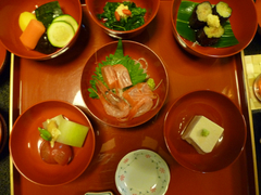 法事があって、深大寺の近くの「柏亭(042-485-1211)」という店で会食をしました。参詣客で賑やかな参道からは少し離れ、クルマの通る道からも少し路地を入った奥にある店なので、静か。さりげなく、風情のある入口は、都会の喧騒を逃れて静けさへいざなわれるという感じです。法事だから精進料理、というわけでもなく、一つひとつが工夫された小鉢は、和食の美しさとおいしさを楽しめ、あっさりと味つけされた野菜料理はダイエットにも最適です(^_^;)