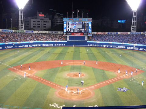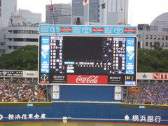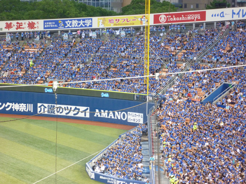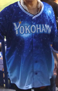 一昨日、昨日、今日の3日間、横浜スタジアムでは、来場者全員に(土曜日は先着だったらしいのですが)、選手と同じデザインの夏のユニフォームをプレゼントという企画をやっていました。私が行ったのは今日だけなのですが、3日間、エンブレムの色が微妙に違うのだそうです。行ってみて、びっくり。これが、あの、横浜スタジアムですか? というくらい、人がいっぱいです。到着したのはプレーボール5分前、シーズンシート入口以外の入口はどこも長蛇の列で、「内外野ともチケットは完売です」というアナウンスがたびたび流れていました。