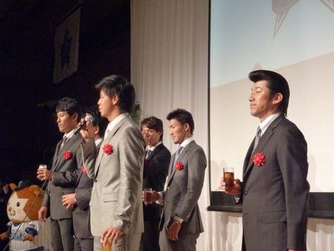 昨年は、確か6人の選手が参加したのではなかったかと思いますが、飲食+選手インタビュー+サイン・撮影会のような感じでした。今年は頭角を現し始めた若手を交えて9人の選手が参加し、3人ずつのトークショーと抽選で私物のプレゼントが行われました。その分、サイン・撮影などをする時間が極端に少なく、途中で時間切れ打ち切りなったりして。普段は分別くさい顔をしている大のオトナが嬉々として行列に並んだりするわけですから、この時間が短いというのは不満のもとになりそうです(笑) 3人がトークしている間に他の人はサインに応じるとか、なんとかやりようがあるだろうに……と、あちこちから呟きが聞こえていました。最近、ファンとしての気合はまったく感じられない私はいいとして、色紙をいっぱい買ってやってきた長老たちは、ちょっとさびしそうでした。