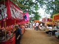 参道にはさまざまな店が並び、名物の「咳止め飴」や「とんとこ飴」を売る呼び声が賑やか。境内には、そう多くはありませんが、冷たいジュースなどを売る露店も立ち並び、目と耳と味わいで夏の休日を楽しむことができそうです。