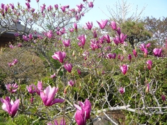 葉桜でもそれなりに美しく、まだ観光客がまばらながら訪れていました。葉桜見物ではなくて、チューリップ見物かも。見事に畝になったチューリップもとてもきれい。隣には水仙の畝もありましたが、これは9割がた終了というところでした。草花の畑には手入れをしている方々の姿が数人あり、参拝客の目を楽しませてくれるための作業に余念がないようです。