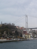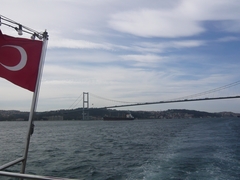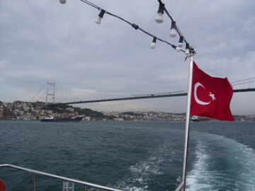 この船はボスポラス海峡の旧市街側を通って新ボスポラス大橋まで行き、新市街側を通って戻ってくる。デッキは風が強くて、ちょっと肌寒い。岸辺に建っているイスタンブールの遺跡や特徴のある建物が次々通り過ぎていく。