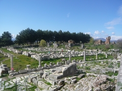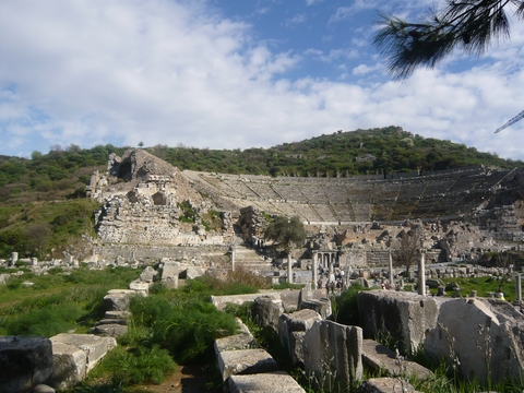 エフェソス遺跡でいちばんすごいのは、やっぱり円形の大劇場だろう。スケールの大きさに圧倒される。ヘレニズム時代に創設され、ローマ時代に拡張されたそうだが、当時の最大のものだった。2万4,000人を収容できたという観客席は、直径154メートル、高さ38メートルもあるとか。ピオン山に沿って造られ、芝居の上演や全市民参加の会議の会場になっていた。ただいま、外側部分の修復が行われているようだ。