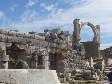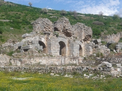 アーチが見えるのは「ポリオの泉」。ここは東ローマ帝国のもとでも、エフェソスは引き続き政治と経済の中心であり、また教会の中心でもあったとか。7世紀にはいると、ペルシアやアラブの勢力が強くなったため、都市を守る城壁が造られた。この頃には、すでに港は土砂で埋まりかかっていたらしい。その結果、外へ港を求めることになり、都市は拡大した。そののちも交易を担う都市であり続けたが、8世紀にたびたびアラブ人の攻撃を受けて、東ローマ帝国はこの地を捨てた。そ管理されなくなった港は完全に埋まったのはそれ以降という。